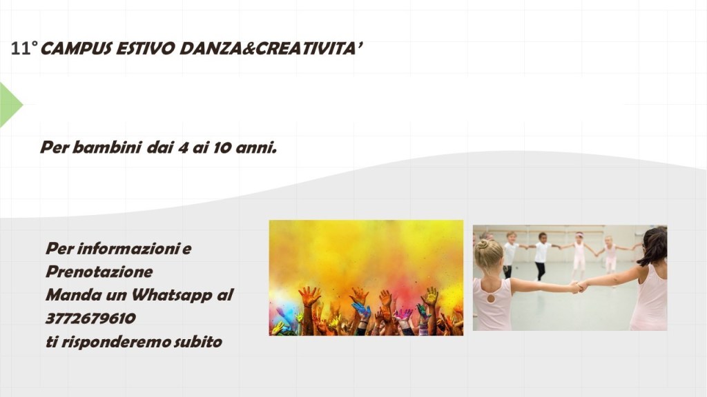 campus danza&creativita' 11° Campus estivo Giugno, luglio e settembre Condividi: Fai clic per condividere su X (Si apre in una nuova finestra) X Fai clic per condividere su Facebook (Si apre in una nuova finestra) Facebook Mi piace Caricamento... Correlati